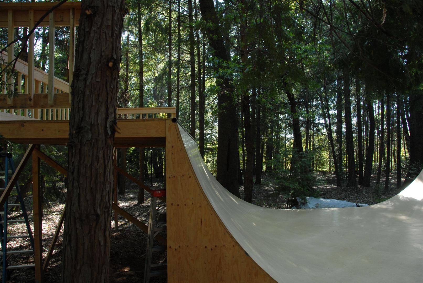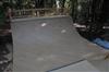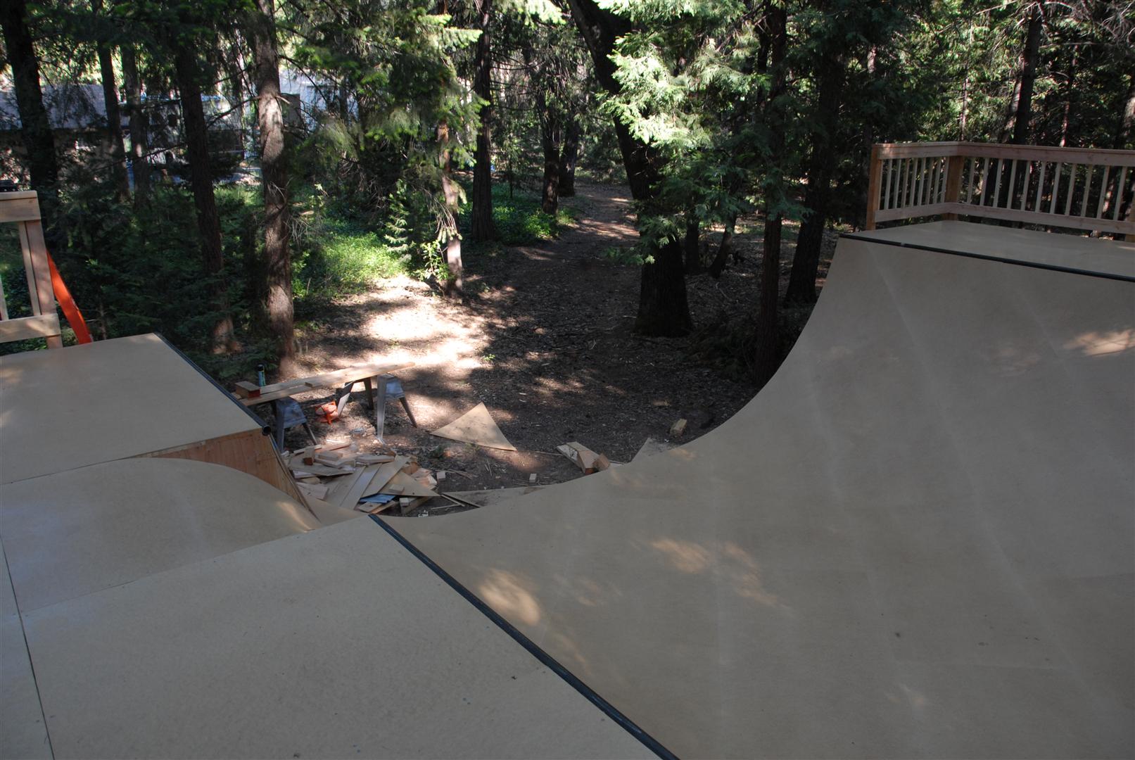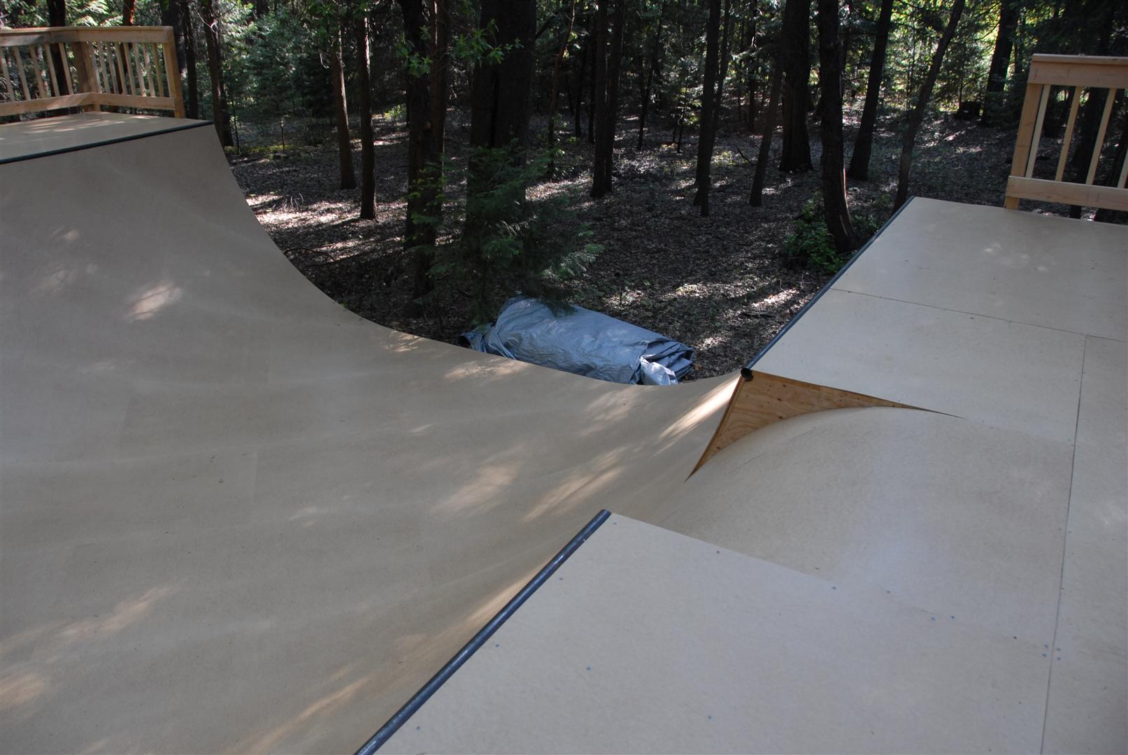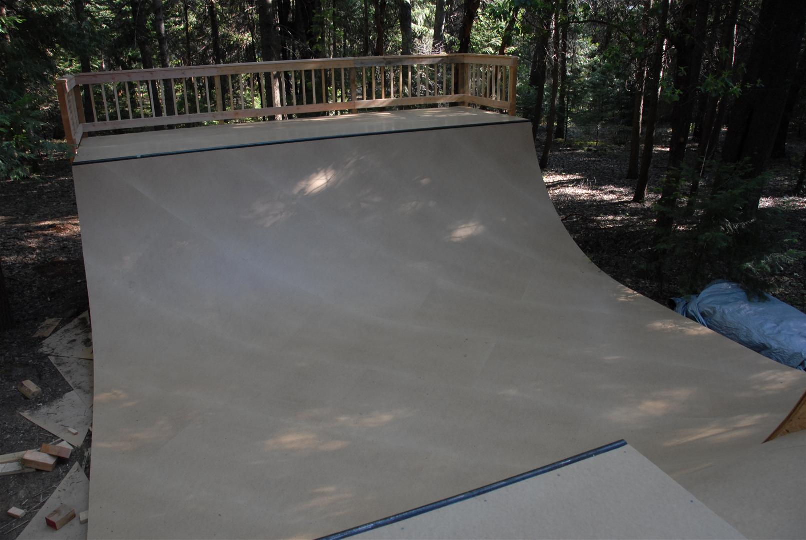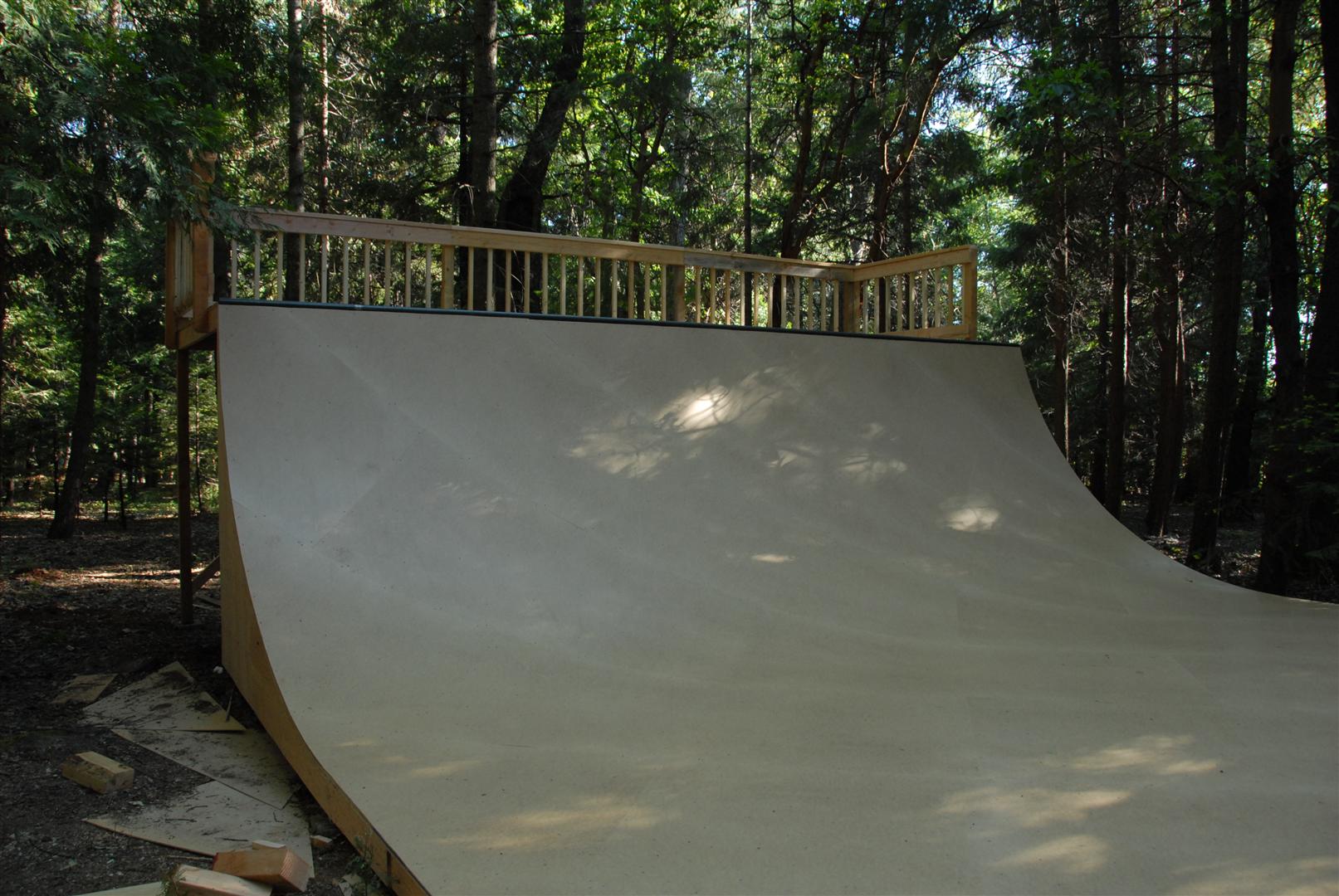 When I was about 17 years old I skated a ramp in Majeska Canyon over the summer. Ever since then I've compared every ramp or skate spot to it. When it came time to build my own ramp, there was no choice but to build with those dimensions in mind. One change I did make was I made my ramp 8 feet wider then that Majeska ramp. This ramp is 7 feet high with a 9 foot transition. It's 24 feet wide and has 8 foot deep decks on both sides. The roll-in is 4 feet wide and is almost centered. Left of the roll-in is 12 feet wide, right of the roll-in is 8 feet wide. The framework under the ramp is 4x6 timber supported by (25) 12" concrete footings. The vertical transition plywood is 1/2". The riding surface is supported by 2x6's spaced 8" on center, then two layers of 3/8" ply finished with 1/4" Masonite installed on a 45 degree. No seams between any of the layers are lined up. The decks are 2x6 framed with 3/4" ply finished with 1/4" Masonite. The ramp sits about 120' behind the house, in the woods. When the ramp is not in use it's protected from the elements by a gigantic 15ml tarp.