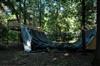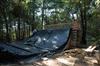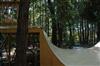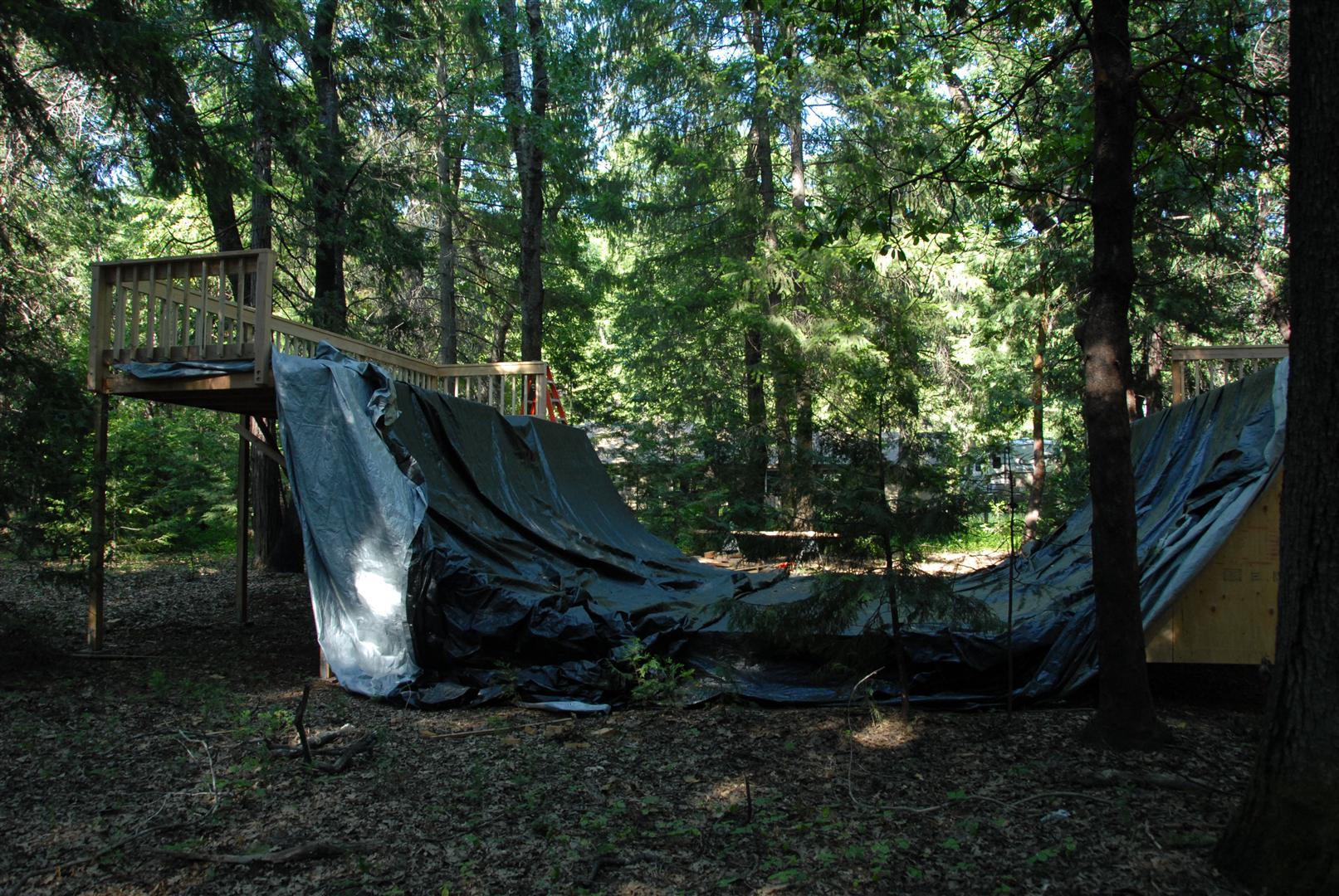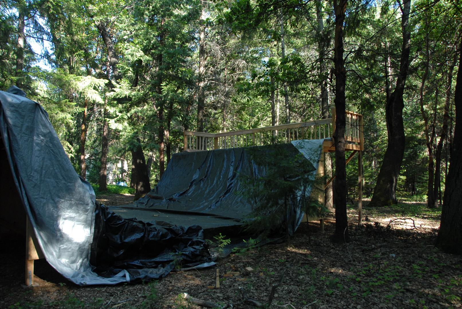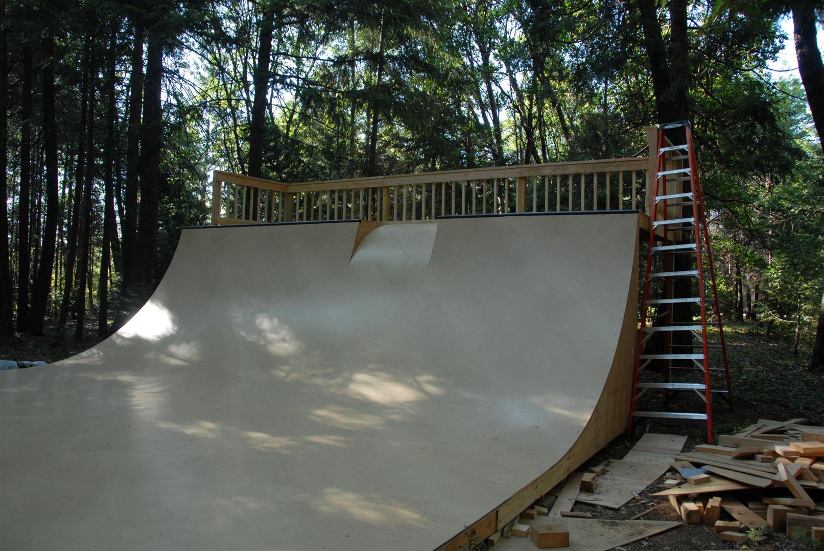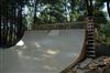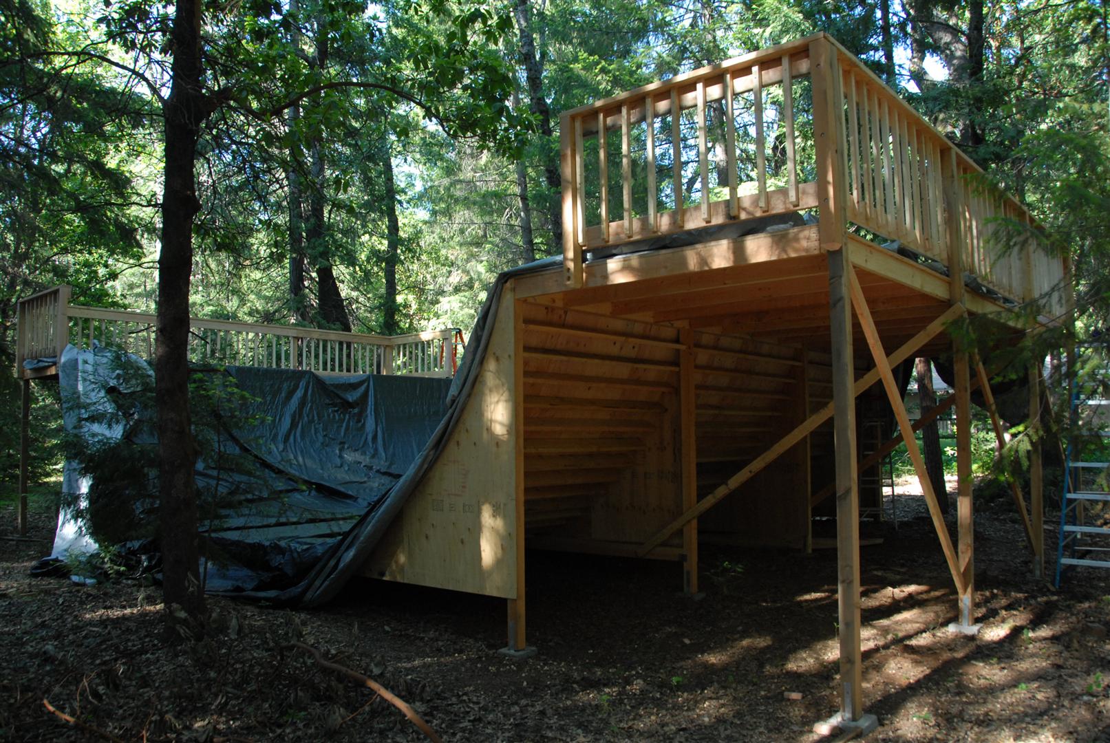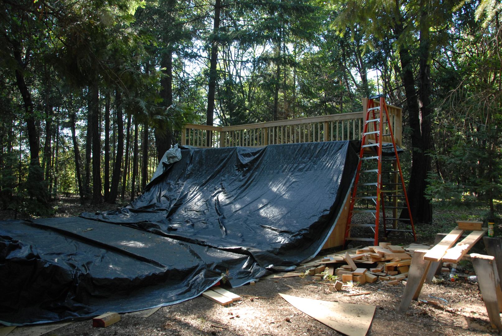 When I was about 17 years old I skated a ramp in Majeska Canyon over the summer. Ever since then I've compared every ramp or skate spot to it. When it came time to build my own ramp, there was no choice but to build with those dimensions in mind. One change I did make was I made my ramp 8 feet wider then that Majeska ramp. This ramp is 7 feet high with a 9 foot transition. It's 24 feet wide and has 8 foot deep decks on both sides. The roll-in is 4 feet wide and is almost centered. Left of the roll-in is 12 feet wide, right of the roll-in is 8 feet wide. The framework under the ramp is 4x6 timber supported by (25) 12" concrete footings. The vertical transition plywood is 1/2". The riding surface is supported by 2x6's spaced 8" on center, then two layers of 3/8" ply finished with 1/4" Masonite installed on a 45 degree. No seams between any of the layers are lined up. The decks are 2x6 framed with 3/4" ply finished with 1/4" Masonite. The ramp sits about 120' behind the house, in the woods. When the ramp is not in use it's protected from the elements by a gigantic 15ml tarp.